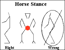 From as low as you can and as hard as comfortable pull your stomach muscles tight against your spine working up as you let your shoulders float up as well. Now breathe and relax your stomach muscles but don't change your position. Check your foot points and make sure you are evenly balanced. Feel your outer balanced circle and discover how much you actually can move while in this stance. It can take years to accomplish an energized horse stance. By energized horse stance I mean the stance actually gives you energy. There is no longer a struggle in fact it has become a desired position.