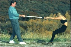 Start in the horse stance and have your partner in a stance that will best balance your weight. Feel your foot connections evenly balanced between all six points. Then, keeping your foot connections evenly balanced simply lean back and lower your center slightly. After you feel the burn or flow starting, check your foot points and make sure you are evenly balanced. If you are, just twist a foot or shift around your edges slightly until the burn turns into a flow. If these efforts don't turn the burn into a flow raise your center slightly. Once you have learned how to turn the burn into a flow it is time to move this energy up your body. To do this you will need to align your leg triangle with your torso triangle. Start by pulling your stomach muscles from their lowest point in the pelvic area tight against your spine. Then shift your lower pelvis forward. Feel your tail bone and point it at your front body triangulation point. This will bring the energy into your pelvic region. If you have lower back problems, like I did, this is very stimulating. It might take a while to work through the blockages but eventually you can move this energy up your spine. Using your shoulders and arms to lengthen your spine, stretch and move until you feel the earth's energy releasing up your spine.